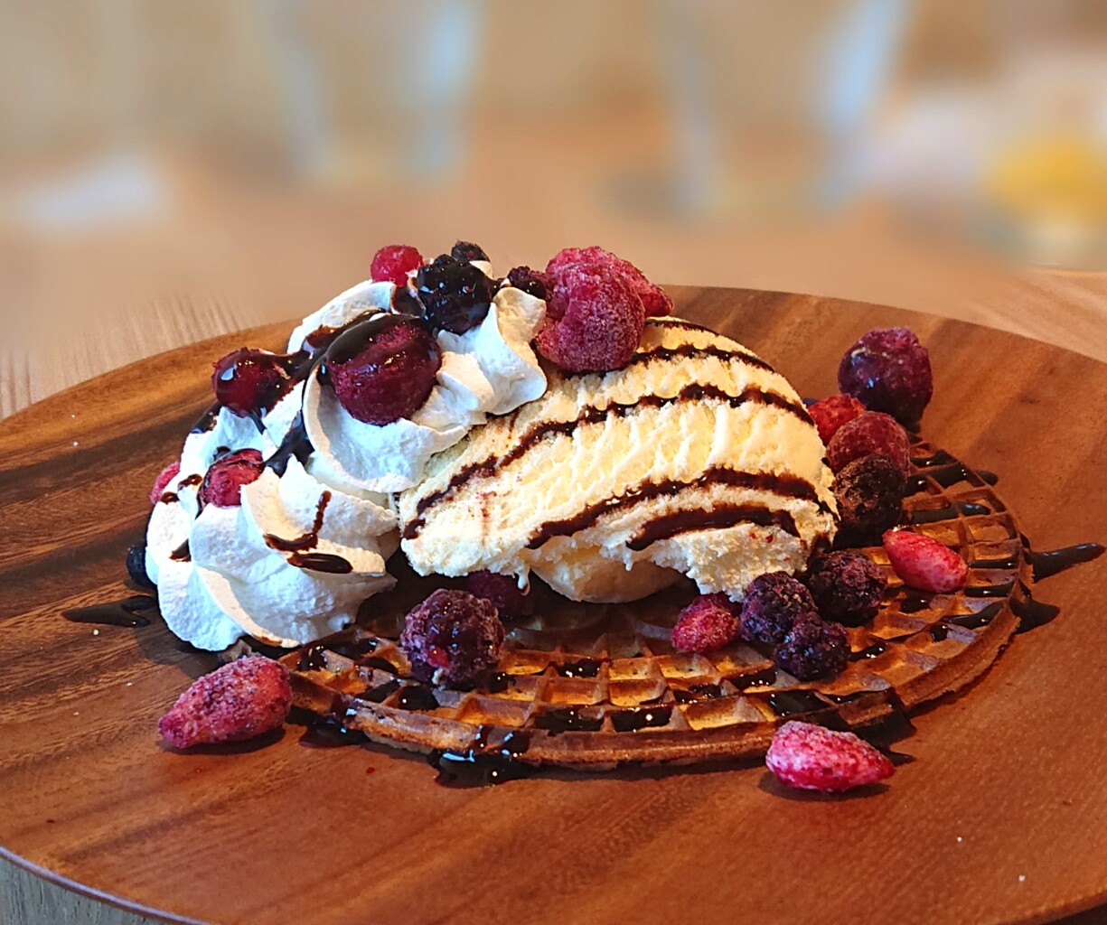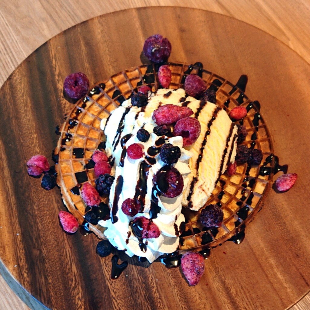しっとり薄めのワッフル生地の上に、アイスと生クリーム♡