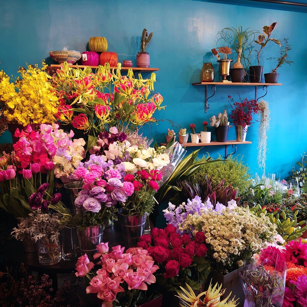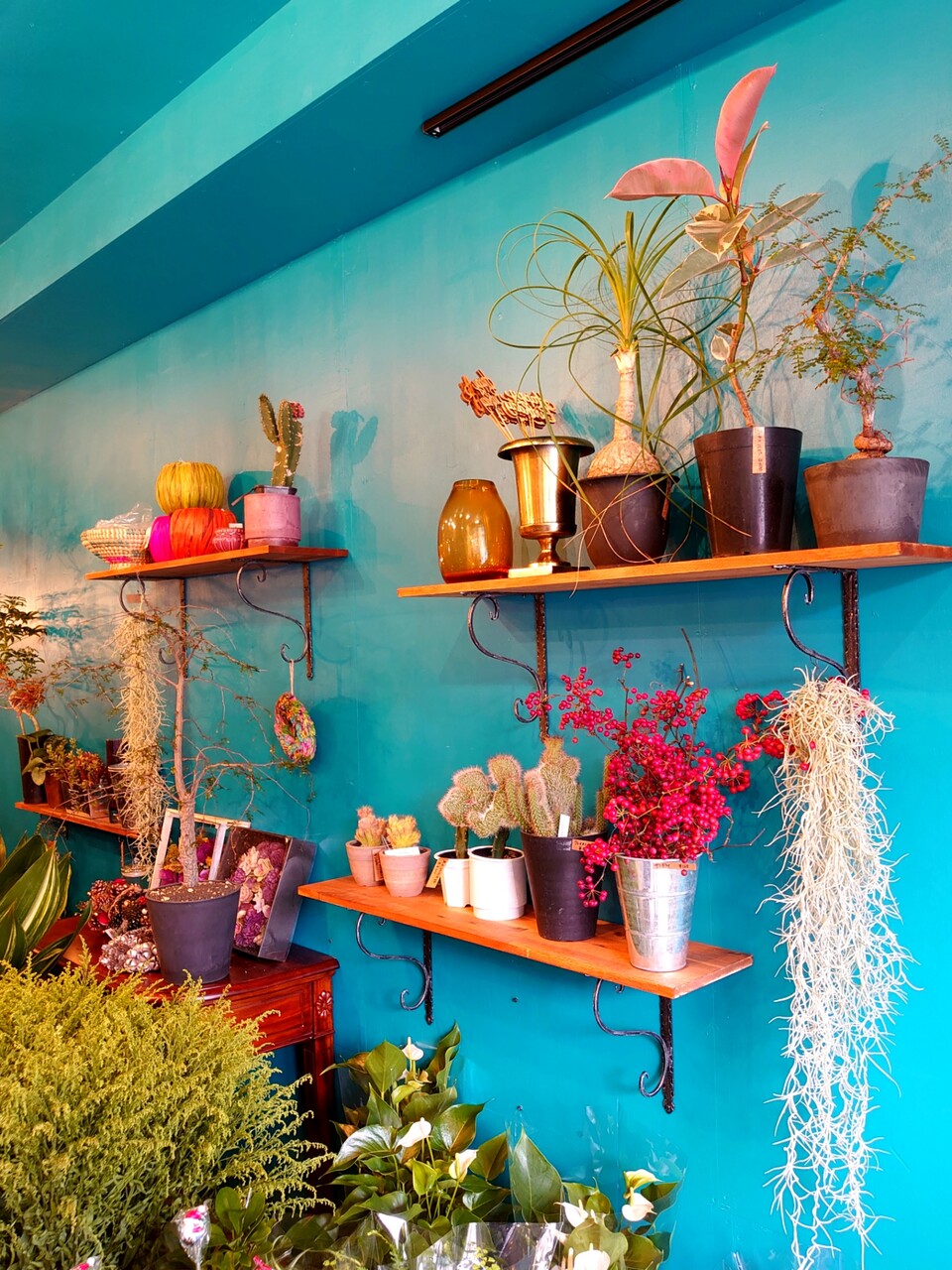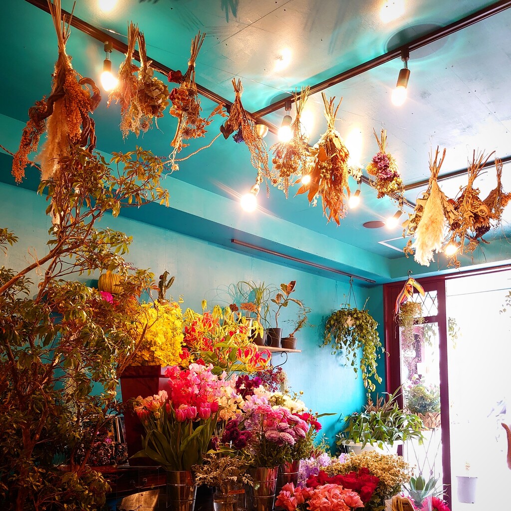 一面ブルーの店内✰°*。花たちが映えてます⤴