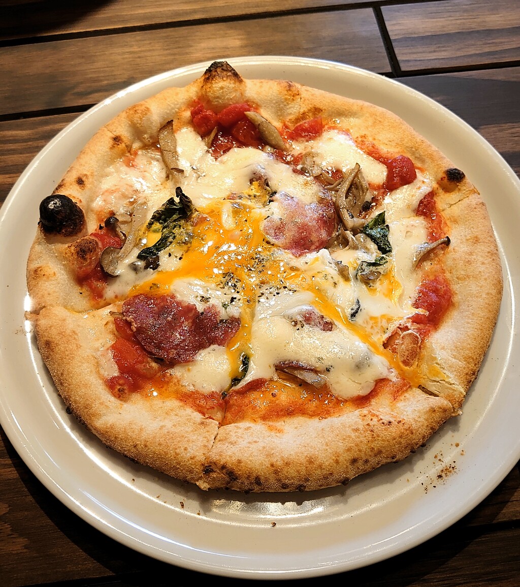キノコ、サラミ、モッツァレラ、バジル、卵のピザ!