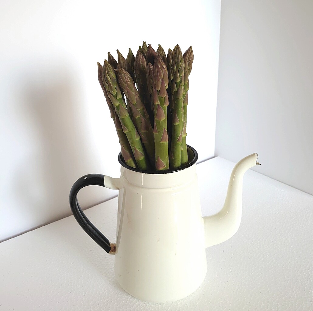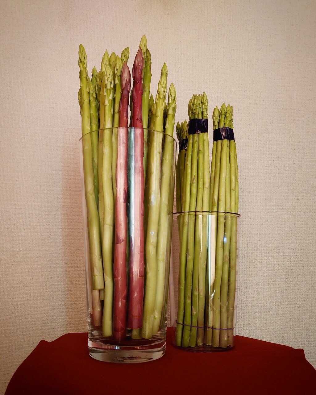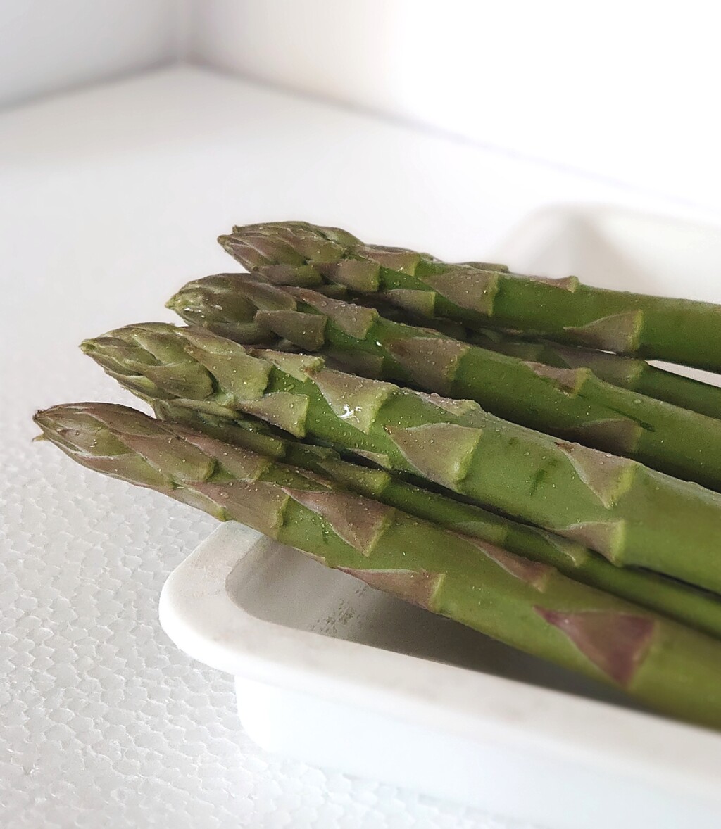 *筒状の容器に少量の水を入れてアスパラを立てて冷蔵保存