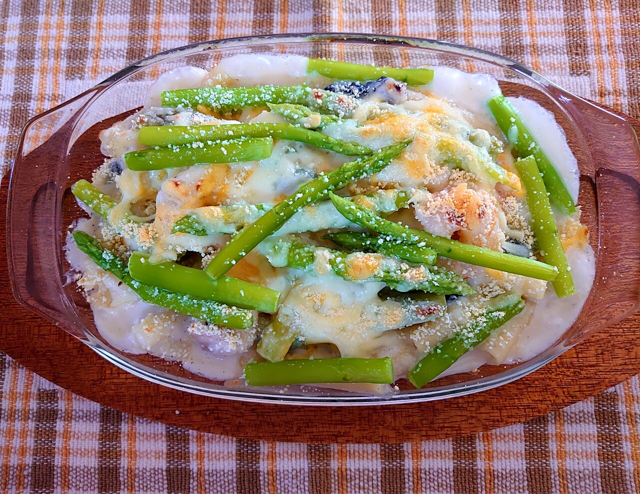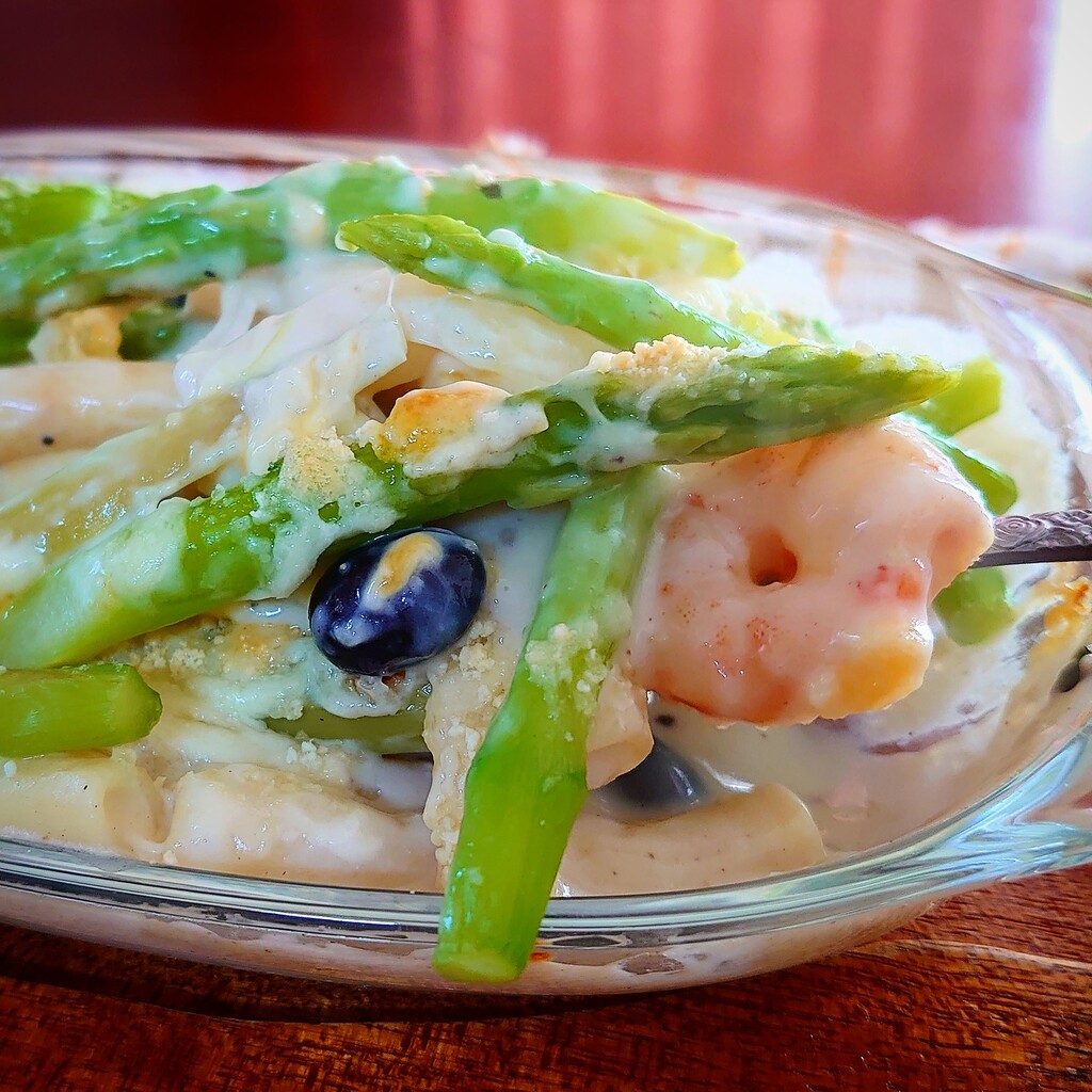 アスパラと海老とチキンと黒豆のグラタン♪
