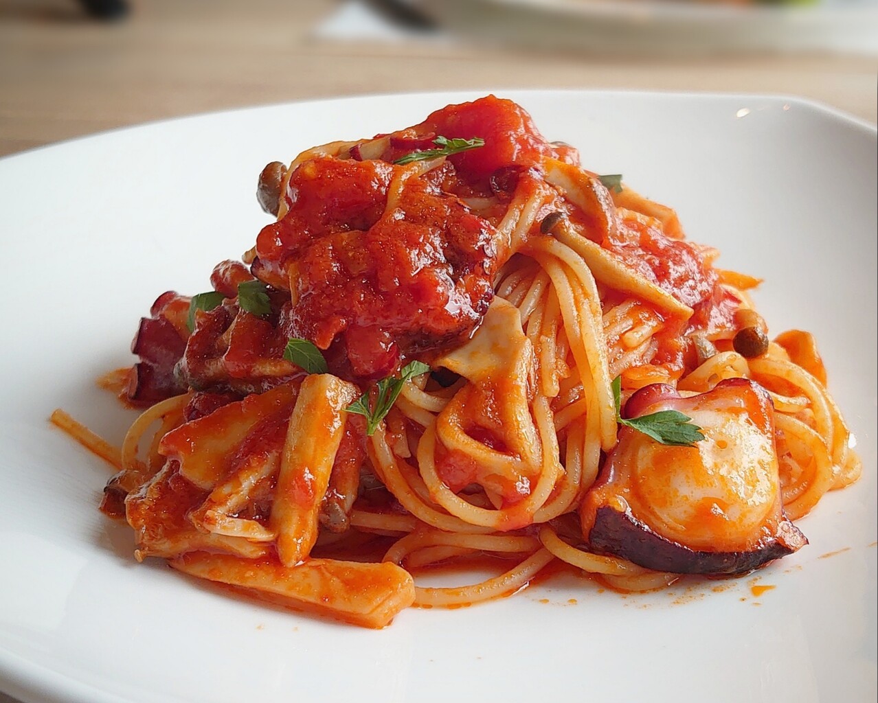 ▷タコとキノコのアラビアータ