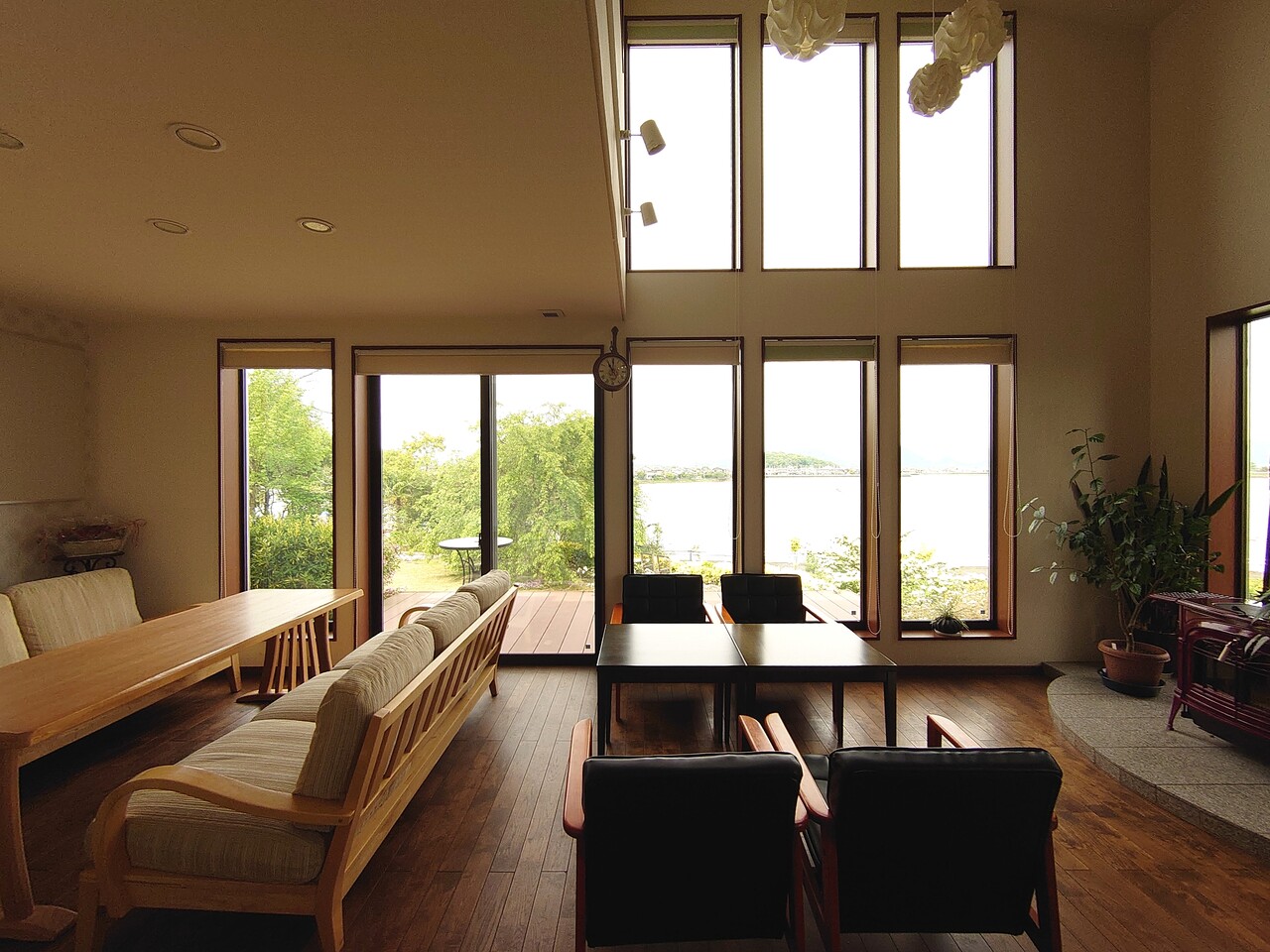 大きな窓から緑や池を眺めながら