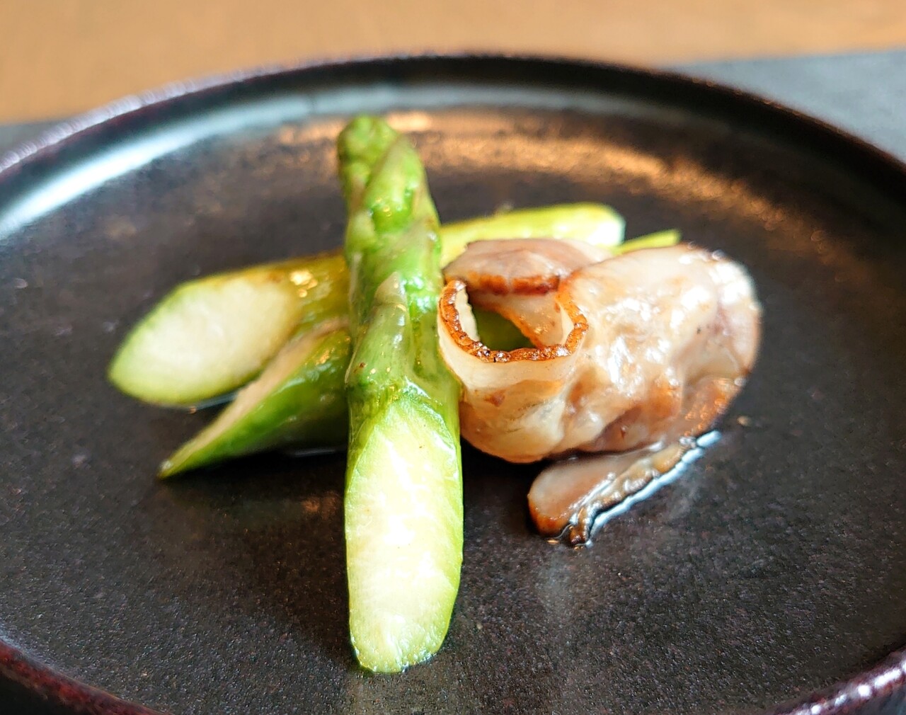 絶妙な焼き加減のアスパラ!自家製ベーコンの脂が絡んで美味。