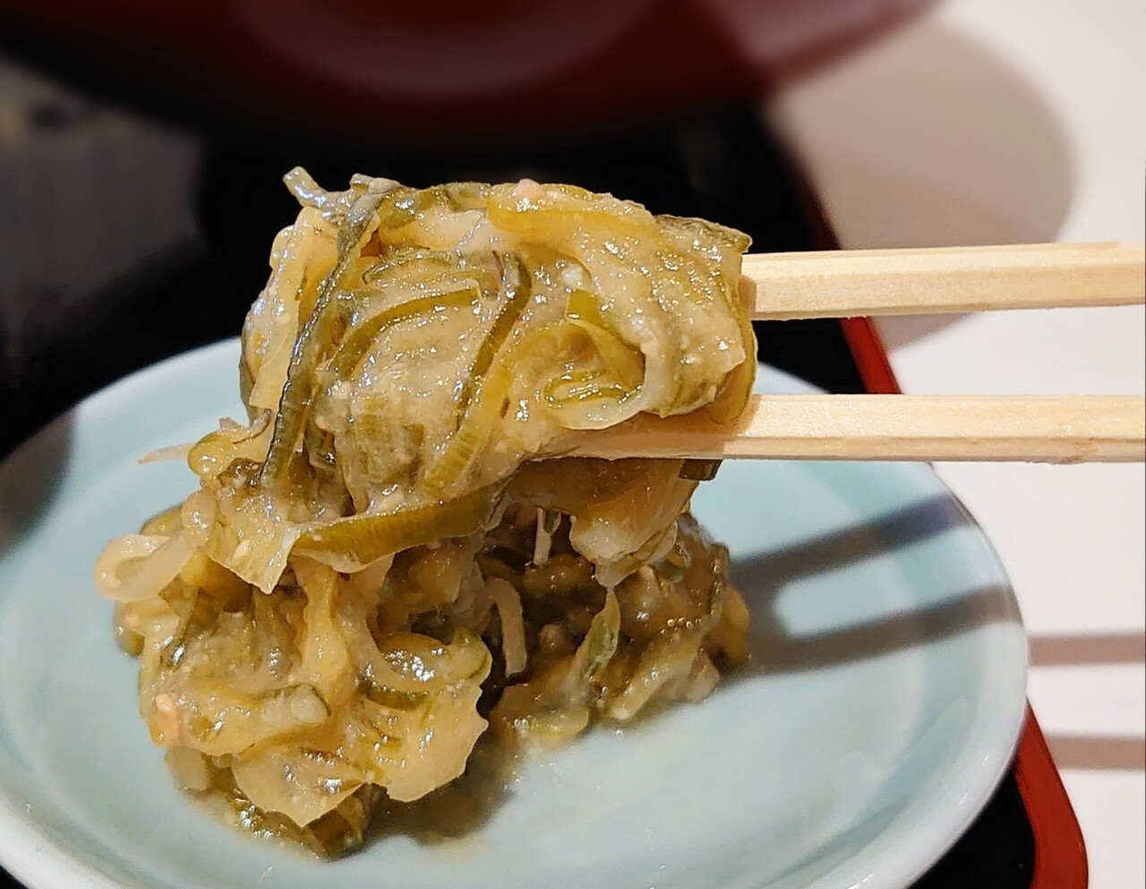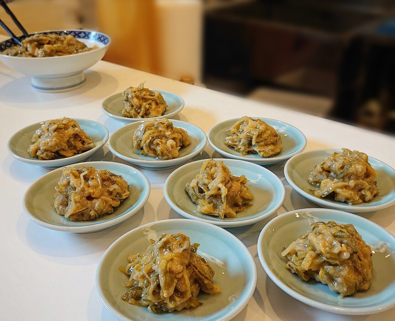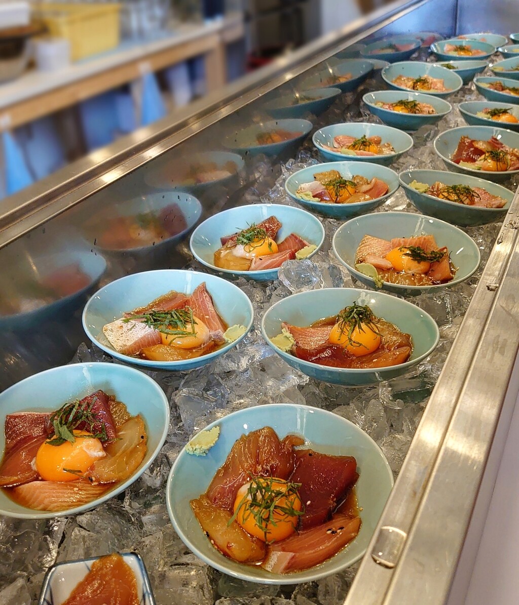 魚の漬け、白めしのお供ぶっかけ、ネギ味噌などが並んでいます。