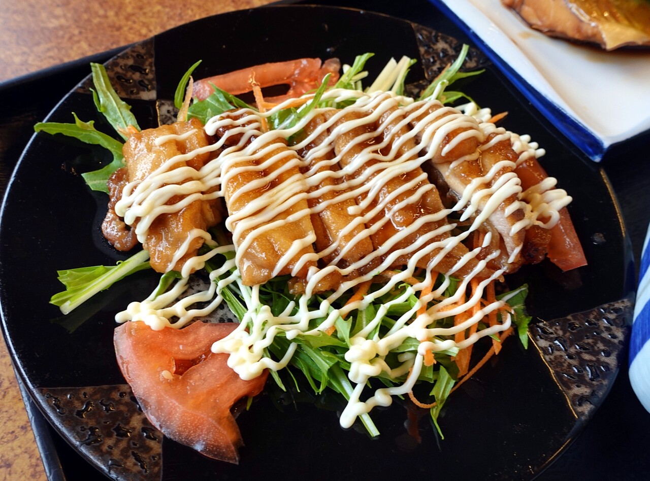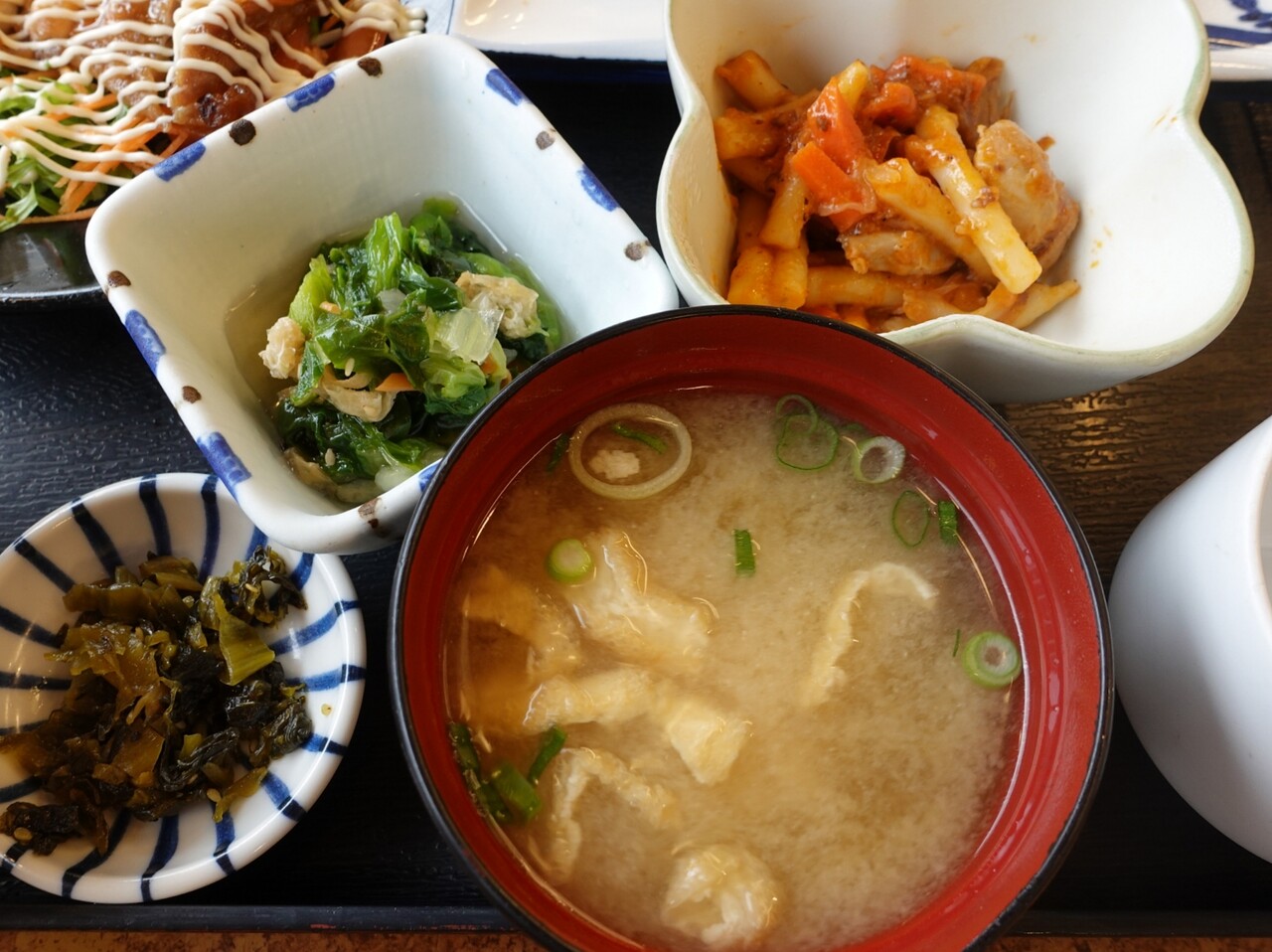 小鉢野菜も2品。お味噌汁はワカメと油揚げ。