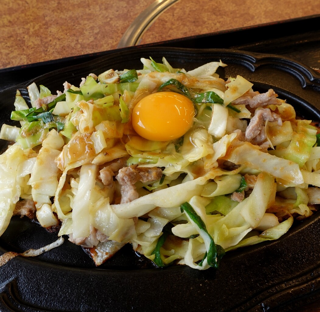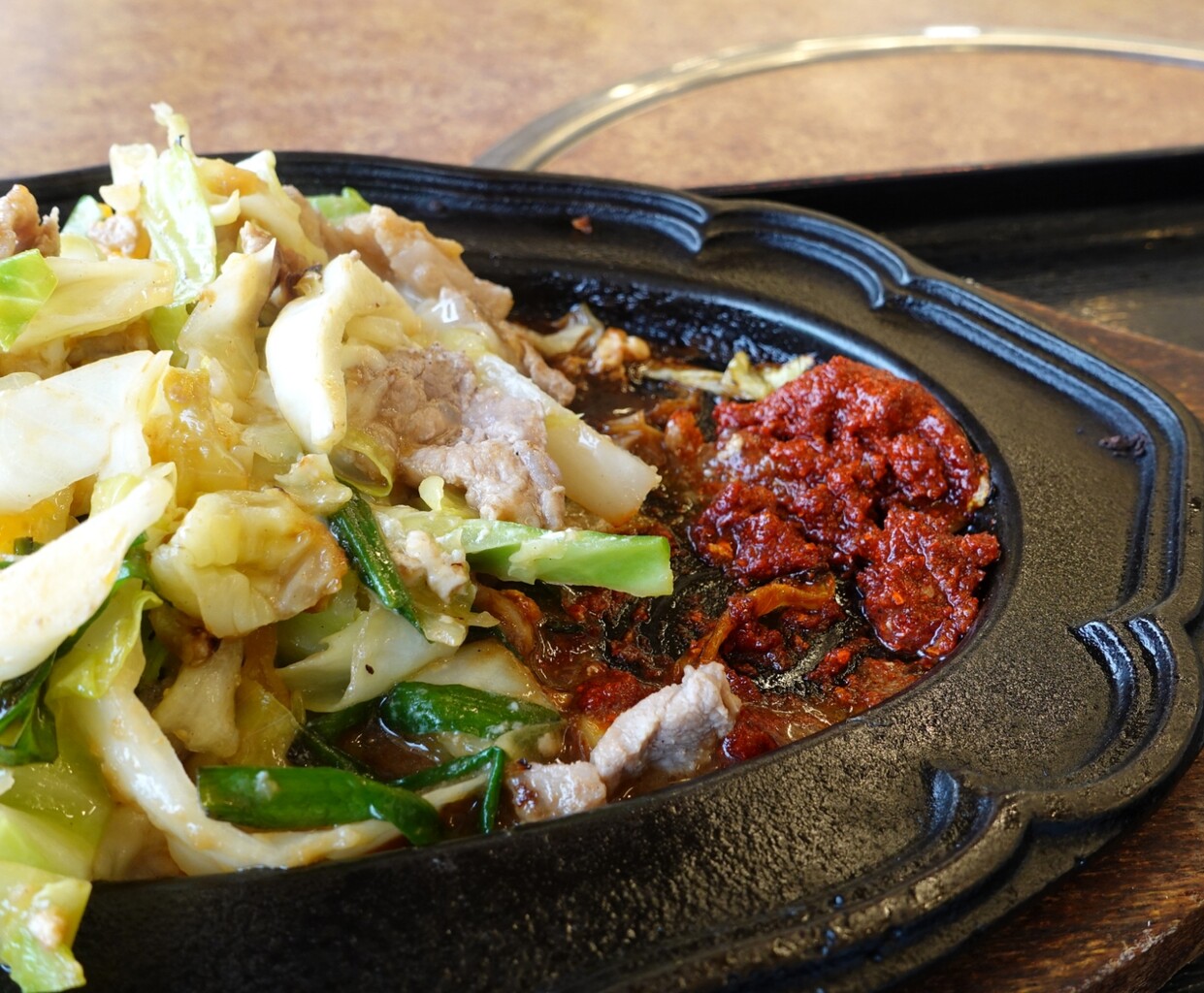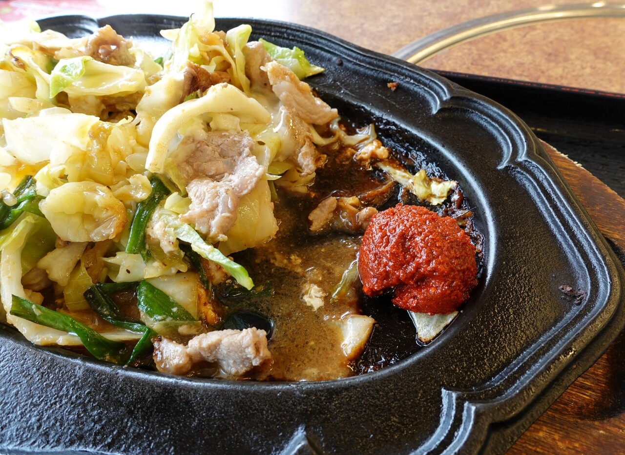 鉄板を少し斜めに傾けて、底の汁気と辛味噌を混ぜ合わせます♪