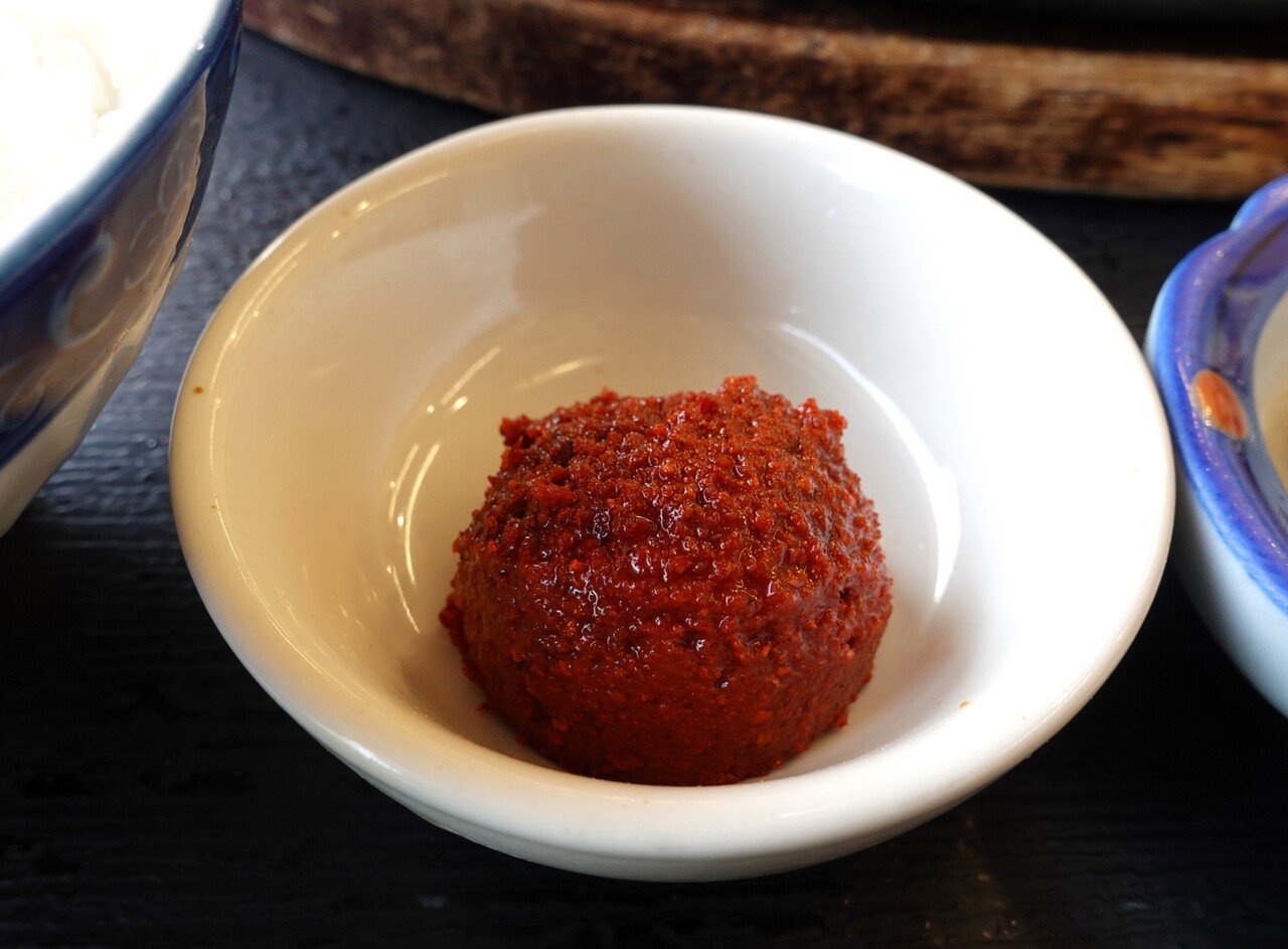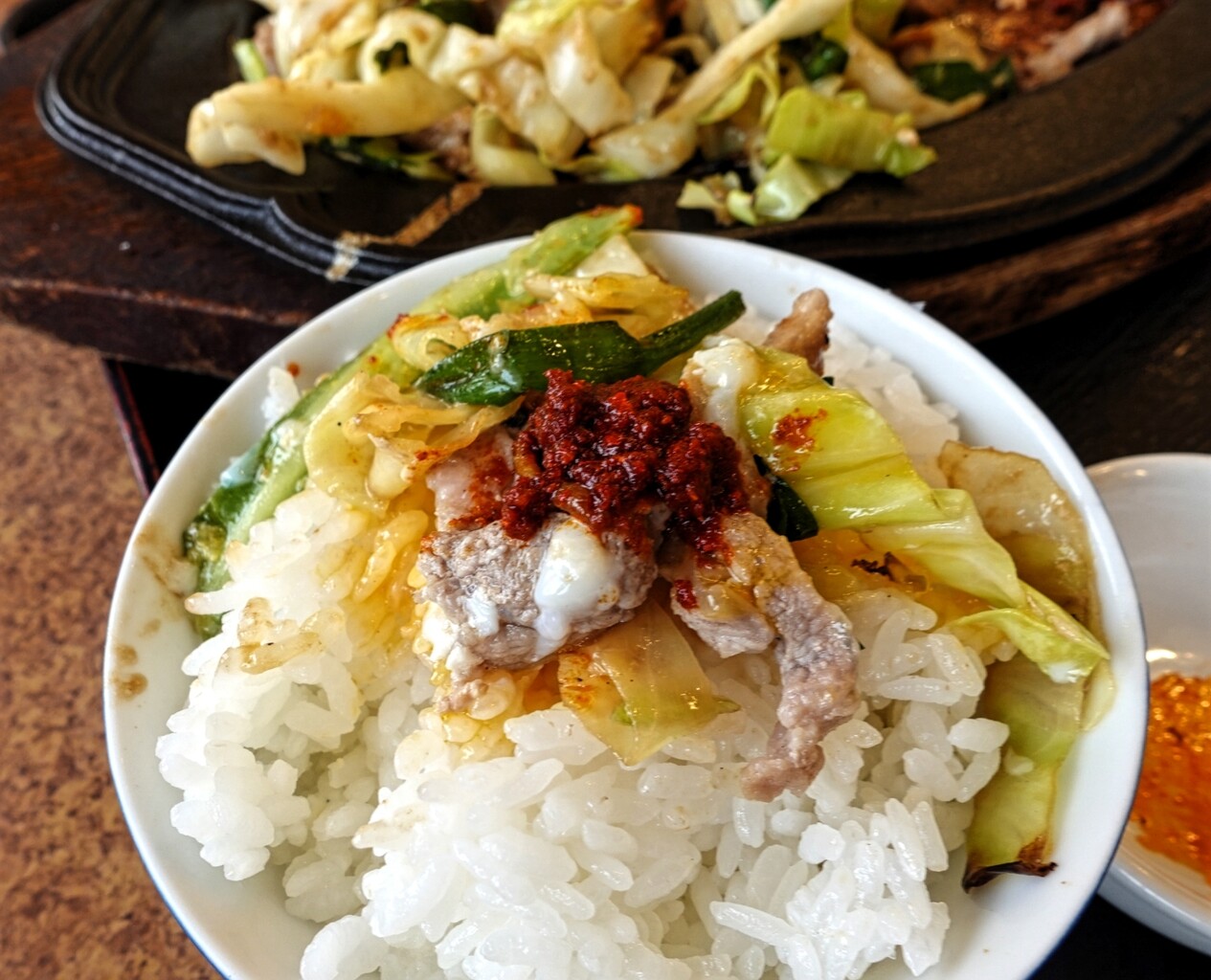 豚肉がサガリ使用なのと、辛味噌で味変するところかな♡