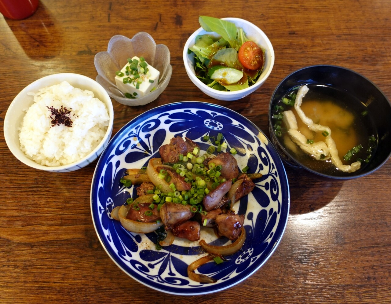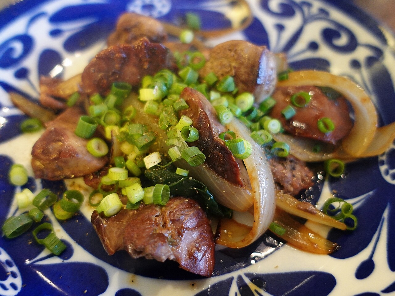 鳥キモとタマネギを甘辛く炒めてて美味しい♬