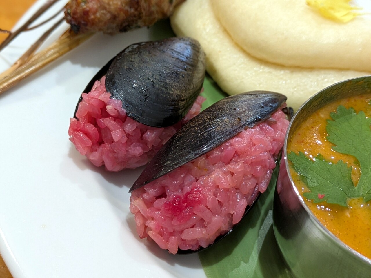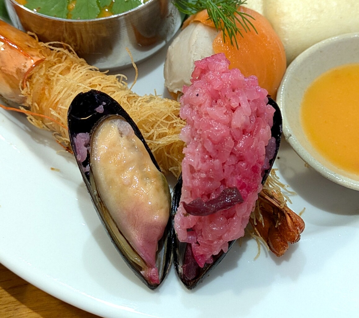ムール貝ビーツライス包みは華やかな赤。