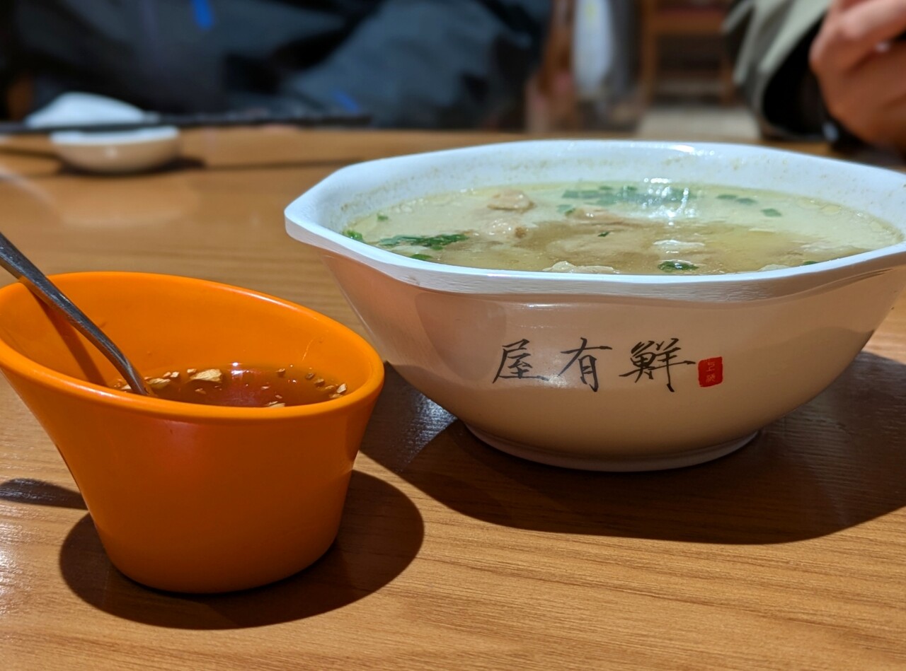 レンゲにワンタンをのせてタレをかけて食べるスタイル。