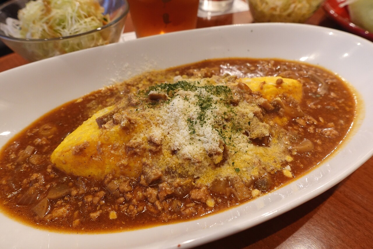 ごはんの入ったオムレツに自家製ソースがたーっぷり☆