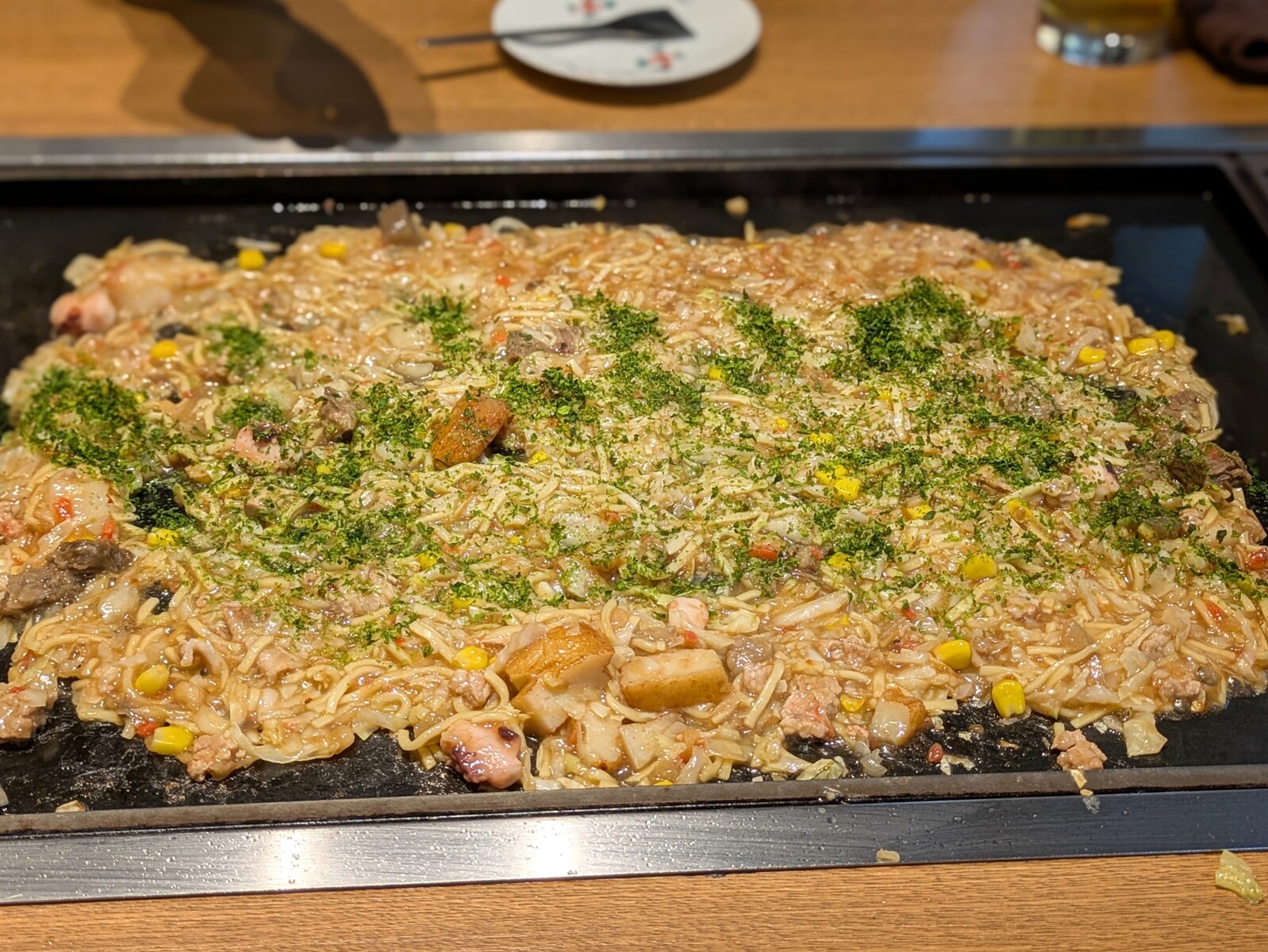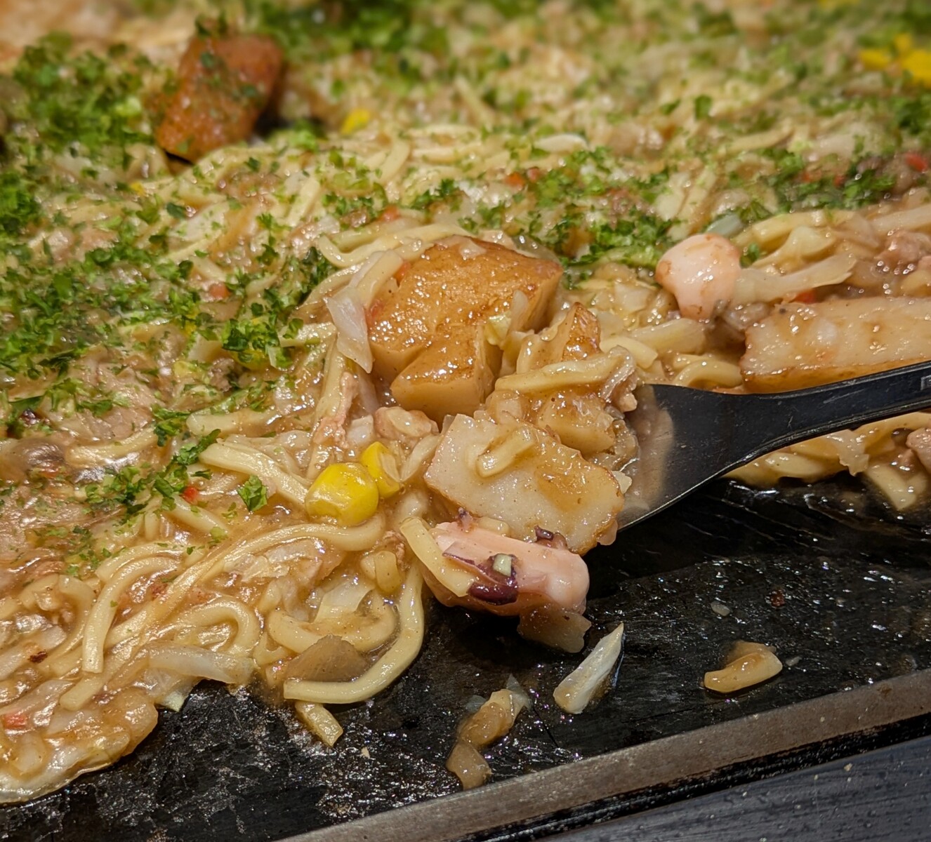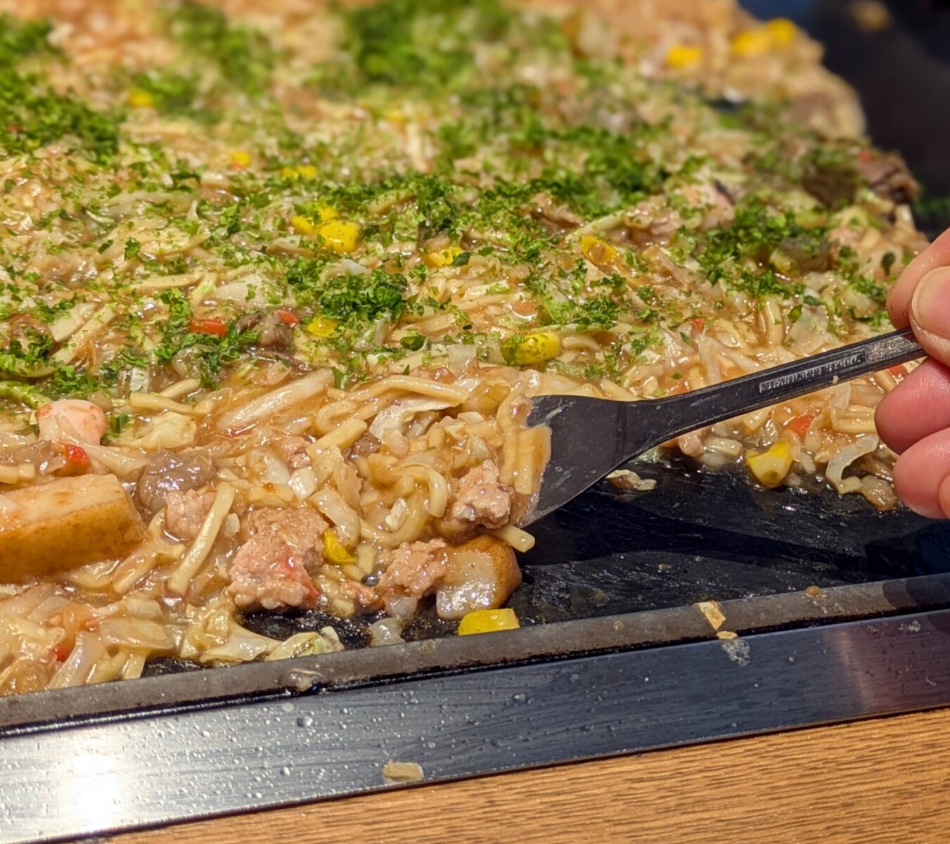 小さなへらで焼き付けながら食べます。お焦げが美味しいんだ!