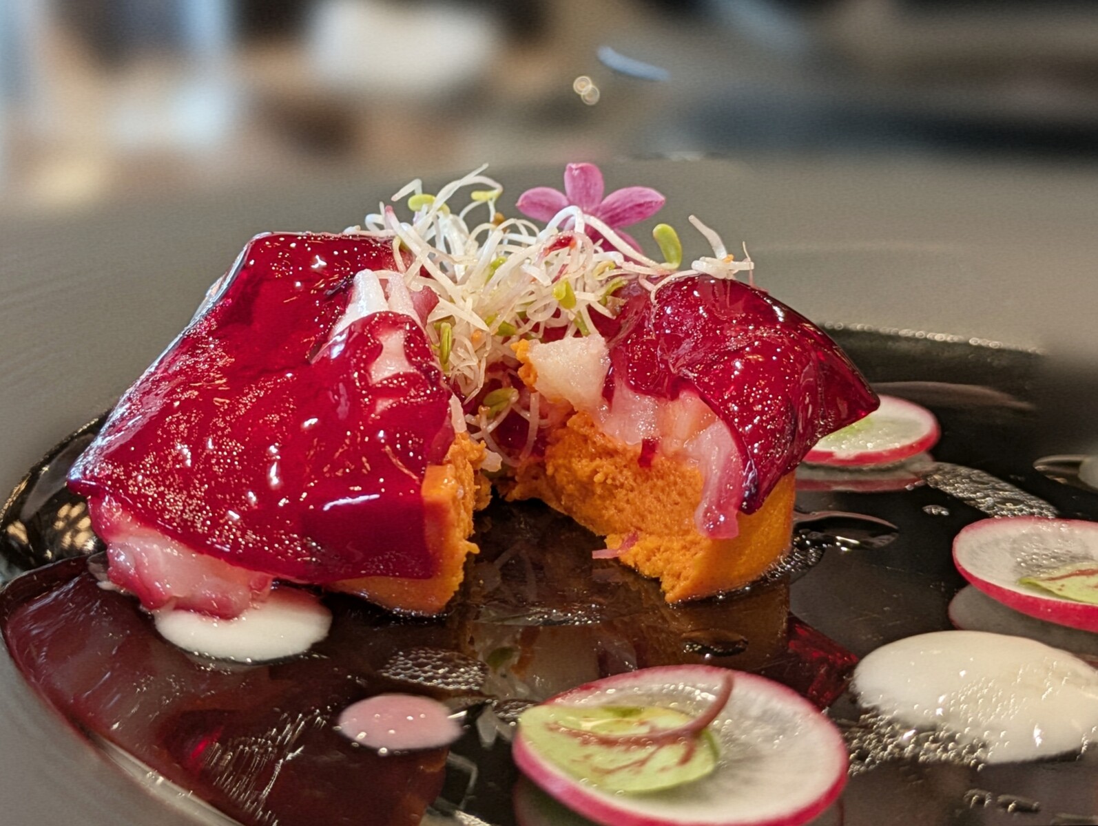 エビとサーモンをふんわり包んでいて、ビーツの真っ赤なベールが艶めいています✽.。.: