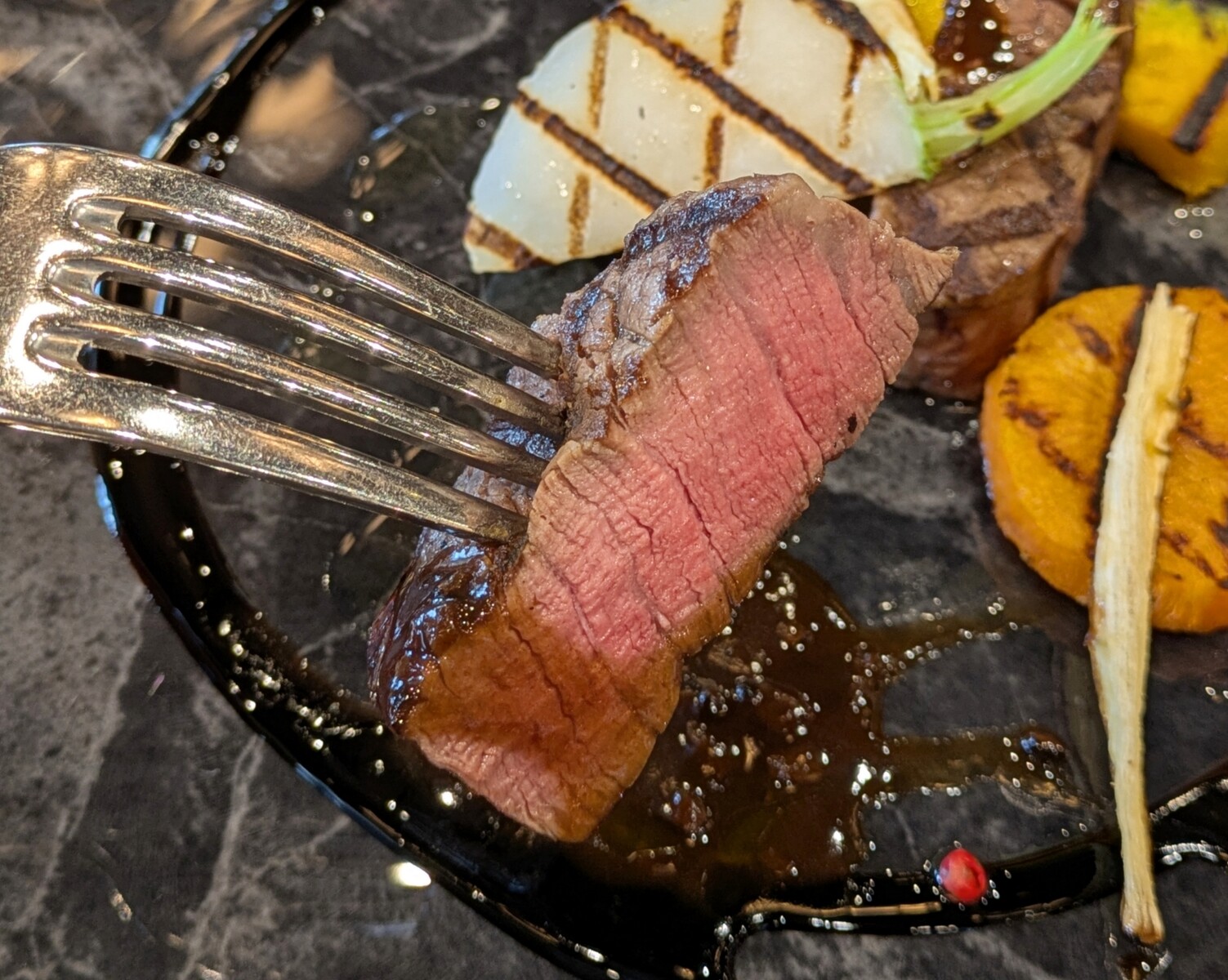 ピンクペッパーが、フィレ肉の旨味を引き立てつつ、